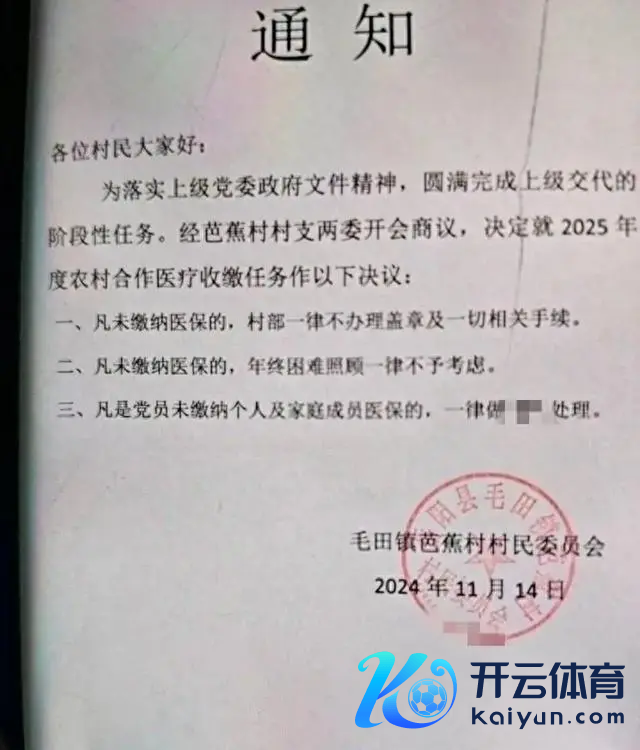 日前,一则湖南某村委会收缴医保的示知在网上传播,激勉眷注。接洽图片暴露体育游戏app平台,一则盖有“岳阳县毛田镇芭蕉村村民委员会”钤记、发给该村村民的示知称,为圆满完成上司叮嘱的阶段性任务,该村村支两委经开会盘考,就2025年度农村合营医疗收缴任务作了三项决策,其中一条为“凡未交纳医保的,年终梗阻护理一律不予商量”。