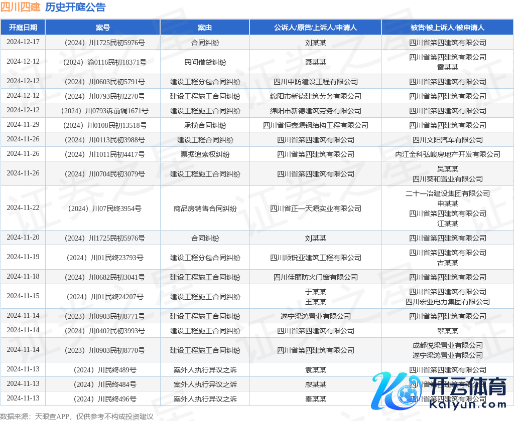 本站音问开云体育(中国)官方网站,证实天眼查APP表示,近日公布了一则四川省第四建筑有限公司算作原告/上诉东谈主的开庭公告,防御施行如下: