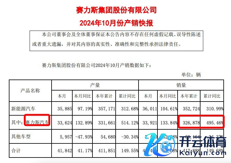 赛力斯发布的10月份产销快报深刻,2024年1~10月,赛力斯累计销量约41.29万辆,同比增长149.68%。其中,赛力斯汽车累计销量约32.68万辆,同比增长495.46%,对赛力斯本年前10个月销量孝敬度近80%。
