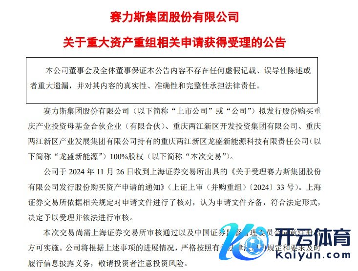 11月26日晚间,赛力斯发布公告称,公司拟刊行股份购买重庆产业投资母基金结伴企业(有限结伴)、重庆两江新区勾引投资集团有限公司、重庆两江新区产业发展集团有限公司捏有的重庆两江新区龙盛新动力科技有限包袱公司(以下简称龙盛新动力)100%股权苦求于2024年11月26日获上海证券交游所受理并照章进行审核。