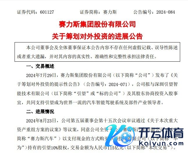 事实上,干涉2024年以来,赛力斯大看成不停。除晓谕收购龙盛新动力100%股权外,赛力斯在本年8月就曾对外晓谕,以支付现款的阵势购买华为技艺有限公司捏有的引望(即深圳引望智能技艺有限公司)10%股权,交游金额为115亿元。同日,赛力斯汽车与华为、引望签署了附要求奏效的《股权转让左券》,商定赛力斯汽车购买华为捏有的引望10%股权,同期赛力斯汽车与华为、引望签署《对于加入之左券》。