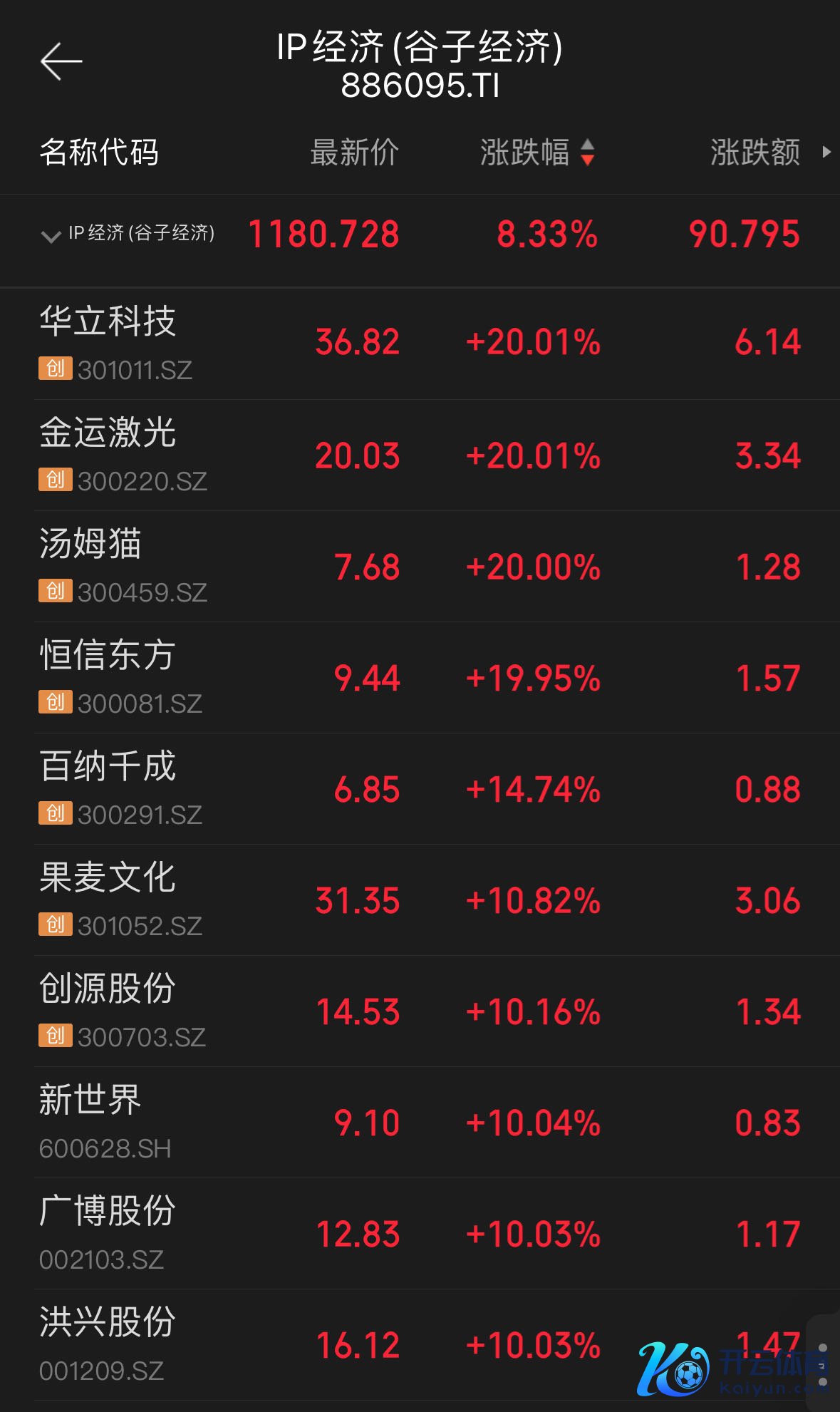 11月27日,谷子经济见识股握续回升。逼迫收盘,实丰文化、浩荡股份再度涨停,双双迎来六连板;华立科技20cm涨停,收成三连板;金运激光、汤姆猫、恒信东方也拿下20cm涨停;新宇宙、祥源文旅、洪兴股份等多只个股涨停,创源股份盘中涨超17%。