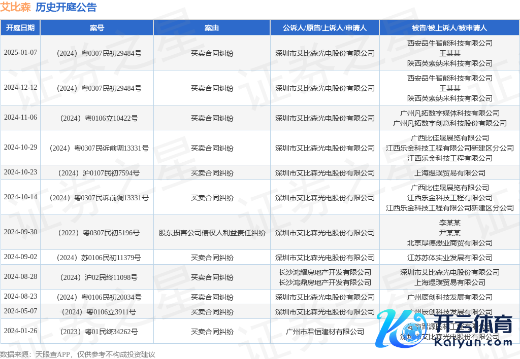 本站音书,说明天眼查APP暴露开云体育,近日公布了一则深圳市艾比森光电股份有限公司当作原告/上诉东说念主的开庭公告,扎眼实质如下: