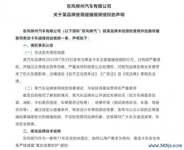 该声明提到,"某品牌未经授权使用并诬蔑传播乘龙卡车碰撞测试视频,已组成严重侵权,泉源平方营业竞争限制;乘龙卡车安合座系严格盲从‘着实场景贯注’原则;东风柳汽行动央国企,坚贞反对任何通过贬损同行、坏心攀比等破损行业生态的行动"。