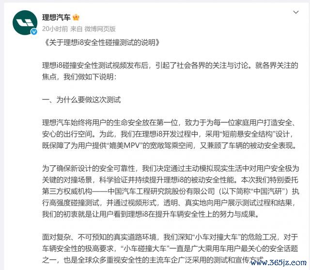 对于近期理思 i8 与乘龙卡车安全性碰撞测试激勉的争议,理思汽车和中国汽研慎重作出公开恢复。